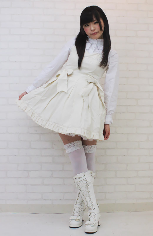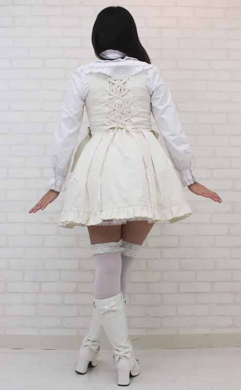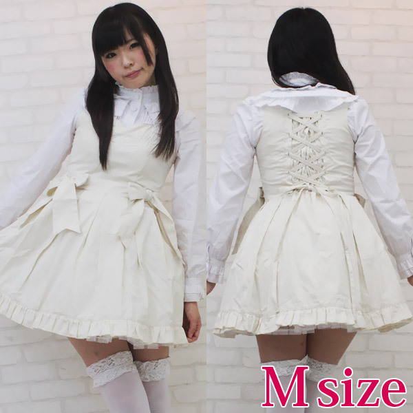 | ■ サイズ・ セット内容 | Mサイズ:B78〜86cm・W62〜74cm 丈:ジャンパースカート76cm・ブラウス49cm(肩幅36cm、袖丈61cm、袖口20cm) セット内容:ジャンパースカート(横ファスナー、後ろ編み上げシャーリング、パニエ内蔵)・ブラウス(前ボタン、後ろ編み上げシャーリング) | ||