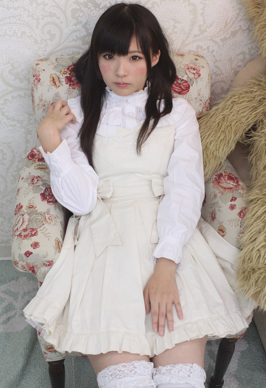 ふんわりフリルが可愛いロリータ服!クラシカルで上品なオフホワイトのジャンパースカート&長袖ブラウスセット(M)。