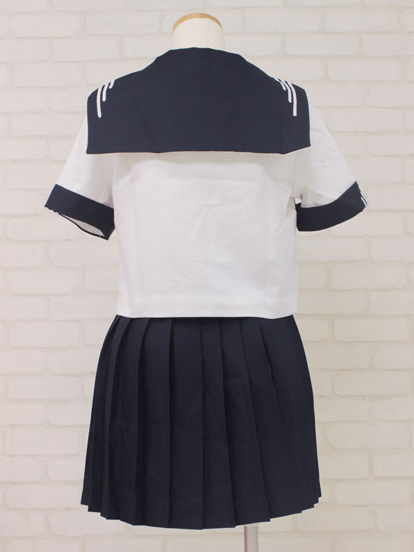 夏服仕様のセーラーブラウスにプリーツスカート、紺色スカーフのセット!セーラー襟と袖のデザインがお洒落なお嬢様風制服コスチュームです。