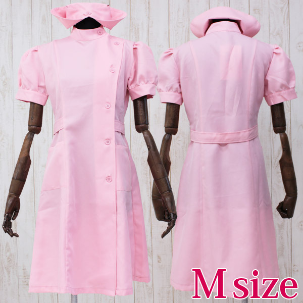 | ■ サイズ・ セット内容 | Mサイズ:B80〜90cm・W70〜80cm ワンピース:着丈98cm 肩幅42cm 首周り37cm 袖丈24cm 袖口周り31cm セット内容:ワンピース(前ボタン留め・立て襟・ポケット付き・裏地無し)、ナースキャップ 素材:ポリエステル100% | ||
