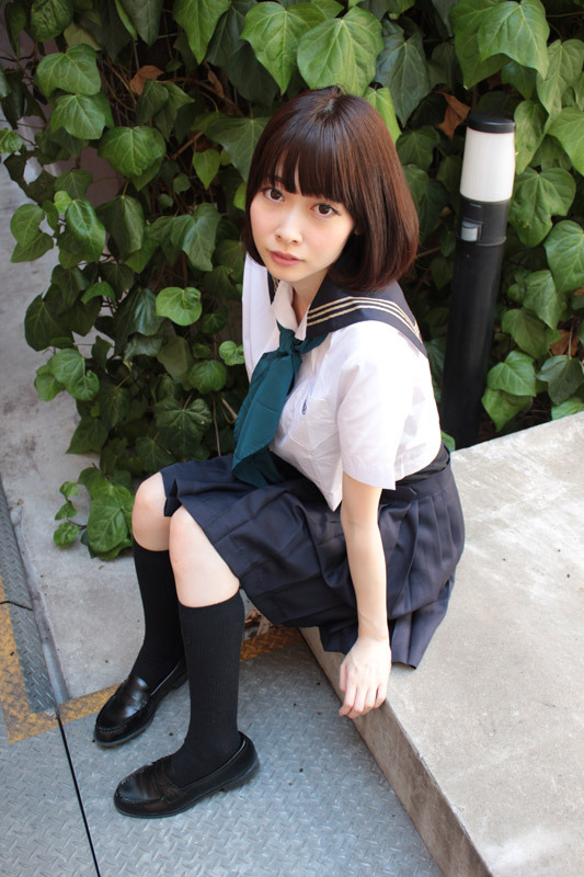 ●3本ラインの紺襟がキリッとかっこいい半袖セーラー●左胸のポケットには校章風の刺繍入り●襟元の白い切り替えと青緑のスカーフがベストマッチ●膝丈のシンプルな濃紺プリーツスカート。