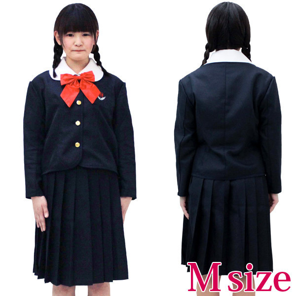 | ■ サイズ・ セット内容 | Mサイズ:B〜95cm・W〜72cm ブラウス:着丈56cm・袖丈18cm・肩幅40cm・首周り40cm ジャケット:着丈51cm・袖丈49cm・肩幅42cm スカート:丈57cm・吊り紐87cm セット内容:ブラウス・ジャケット(前ボタン留、胸ポケット有)、スカート(サイドファスナー、3段ホック留め、ウェスト一部ゴム入)、リボン(アジャスター調整可) | ||
