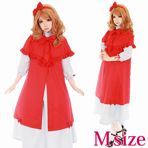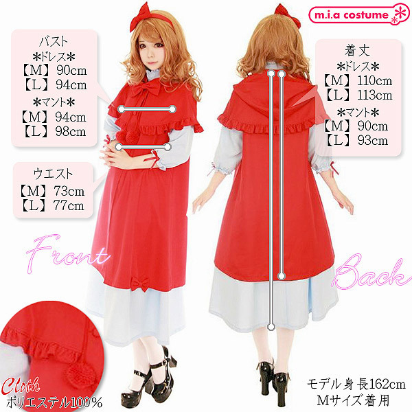 | ■ サイズ・ セット内容 | Mサイズ:ドレス(B90cm・W73cm・着丈110cm)・マント(B94cm・着丈90cm) セット内容:ドレス(後ろファスナー)、マント(前ボタン)、カチューシャ(ブローチピン付き)、ボンボン付きリボン 素材:ポリエステル100% | ||