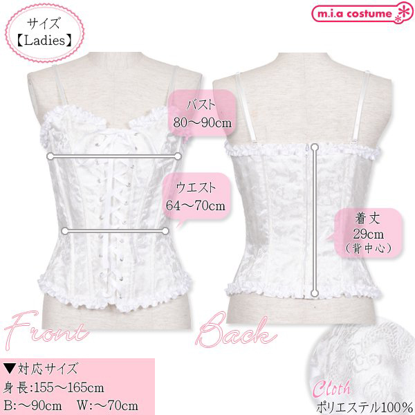 | ■ サイズ・ セット内容 | フリーサイズ:B80〜90cm・W64〜70cm・着丈29cm セット内容:コルセット単品(裏地なし、背面ファスナー) 素材:ポリエステル100% 対応サイズ:身長155〜165cm・B〜90cm・W〜70cm | ||