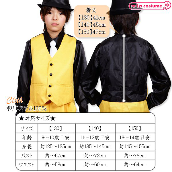 | ■ サイズ・ セット内容 | 140サイズ 対応サイズ:身長135〜145cm・B〜72cm・W〜60cm 実寸:着丈45cm セット内容:ベスト単品(前ボタン) 素材:ポリエステル100% | ||