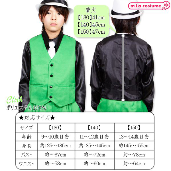 | ■ サイズ・ セット内容 | 150サイズ 対応サイズ:身長145〜155cm・B〜78cm・W〜64cm 実寸:着丈47cm セット内容:ベスト単品(前ボタン) 素材:ポリエステル100% | ||