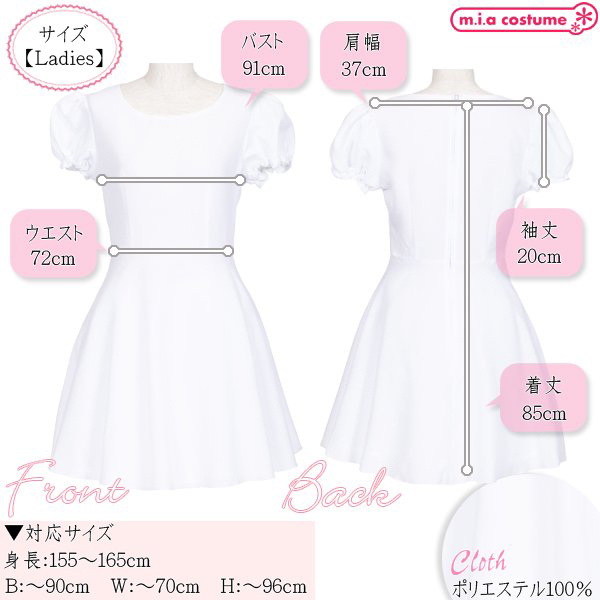 | ■ サイズ・ セット内容 | 対応サイズ:身長155〜165cm・B〜90cm・W〜70cm・H〜96cm 実寸:B91cm・W72cm・肩幅37cm・袖丈20cm・着丈85cm セット内容:ワンピース単品(背中心ファスナー) 素材:ポリエステル100% モデル身長155cm | ||