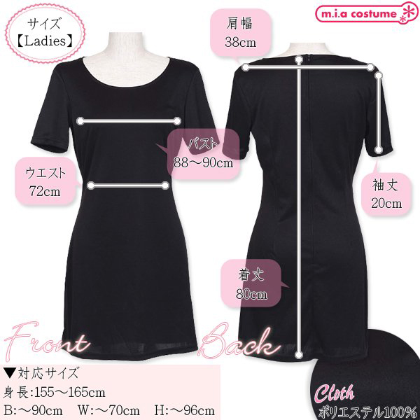| ■ サイズ・ セット内容 | 対応サイズ:身長155〜165cm・B〜90cm・W〜70cm・H〜96cm 実寸:B88〜90cm・W72cm・肩幅38cm・袖丈20cm・着丈80cm セット内容:ワンピース単品(背中心ファスナー) 素材:ポリエステル100% モデル身長155cm | ||