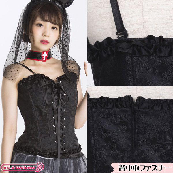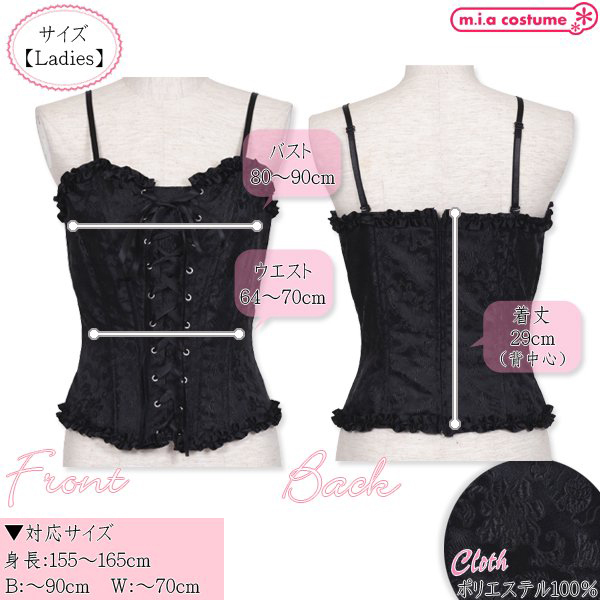 | ■ サイズ・ セット内容 | 対応サイズ:身長155〜165cm・B〜90cm・W〜70cm・H〜96cm 実寸:B80〜90cm・W64〜70cm・着丈29cm(背中心) セット内容:コルセット単品(背中心ファスナー) 素材:ポリエステル100% モデル身長155cm | ||