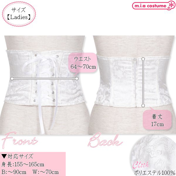 | ■ サイズ・ セット内容 | 対応サイズ:身長155〜165cm・B〜90cm・W〜70cm 実寸:W64〜70cm・着丈17cm セット内容:コルセット単品(背中心ファスナー) 素材:ポリエステル100% モデル身長155cm | ||