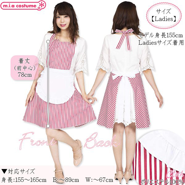 | ■ サイズ・ セット内容 | 対応サイズ:身長155〜165cm・B〜89cm・W〜67cm 実寸:着丈78cm(前中心) セット内容:エプロン単品(首リボン、腰リボン) 素材:ポリエステル100% | ||