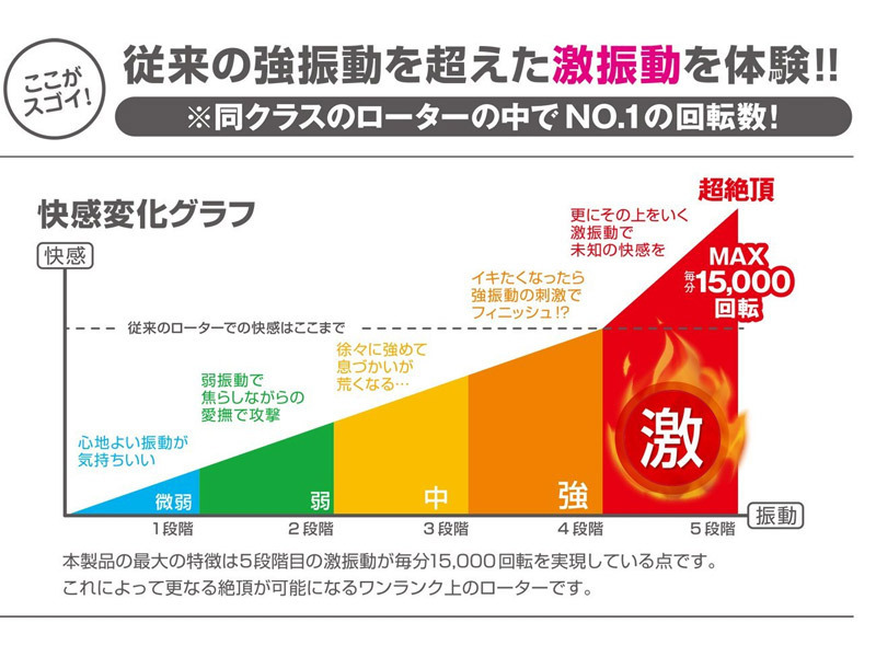 従来の強力振動を遥かに超えた「激」モードで絶頂体験!MAX15000回転のピンポイント責めで、連続アクメ地獄へと陥れるダブルローター(ピンク)。