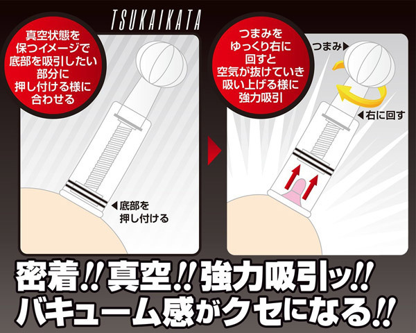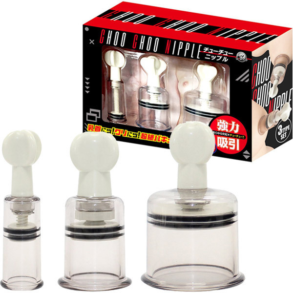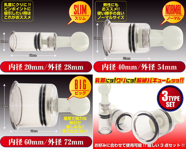 ●乳首やクリトリスに使える吸引具●それぞれ異なる三種サイズセット●底部を押し当てつまみを右に回す●内部が真空状態になり強力に吸引●内径:スリム20mm、ノーマル40mm、ビッグ60mm。