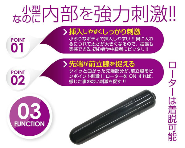 アナルプラグのようなストッパー付きの本体は先端が前立腺をしっかり捉えるジャスト形状!クビレ部分が抜け落ちを防ぎつつ、クイッと曲がった先端部分が前立腺に直撃!ピンポイントでしっかり捉えて内部を強力に刺激します。