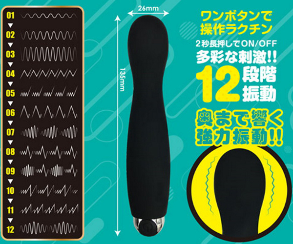 小型なのに奥まで響く強力振動!!12段階の振動パターンが多彩な刺激を生み出す。ワンボタンで操作もラクチンだからプレイに集中できます。<ブラック>シルクタッチな肌触りとスムーズヘッドが初心者にも安心の簡単挿入サポート!ボディ中腹が膨らんでいるので内部を圧迫して満たします。●上質なシリコン素材●ワンボタンで楽々操作●生活防水機能●USB充電式