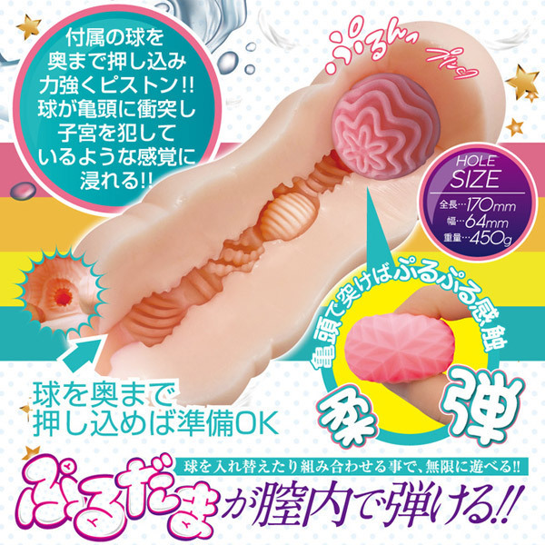 4種類の個性的なぷるだまが多様な刺激を生み出す新感触の非貫通オナホ。付属のボールを最奥に入れることでピストンするたび亀頭を刺激、子宮を突いているような感覚を味わえる♪イボやリング状、ダイヤ模様、ビラビラなど全4種が付属。色んな球を突いて子宮姦を楽しもう!内部は奥へ引きずりこみゴリゴリ刺激する横ヒダ絡むイボ構造◎ローション付属