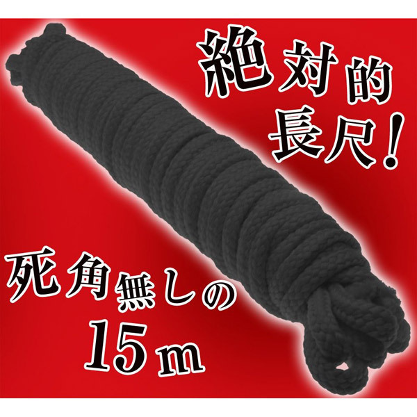 SMの世界へようこそ…!プレイデビューしたい方やビギナーさんでも扱いやすい、ソフト素材のSMロープ(黒)。たっぷり使える長さ15mのロング仕様。亀甲縛りのやり方が写真入りで丁寧に書かれた解説書付きで、初心者さんでもすぐに本格的な縛りプレイをお楽しみ頂けます。ソフトな使い心地で肌も傷めず、痕も残りにくいSM拘束グッズです。