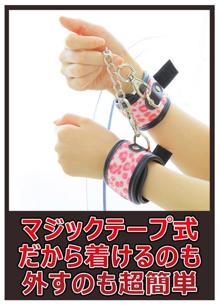 ●豹柄ピンクのチェーン手枷●肌触りの良いフワフワ素材●着脱簡単なマジックテープ式●チェーンは取り外し可能●お手軽にSMの雰囲気を演出。