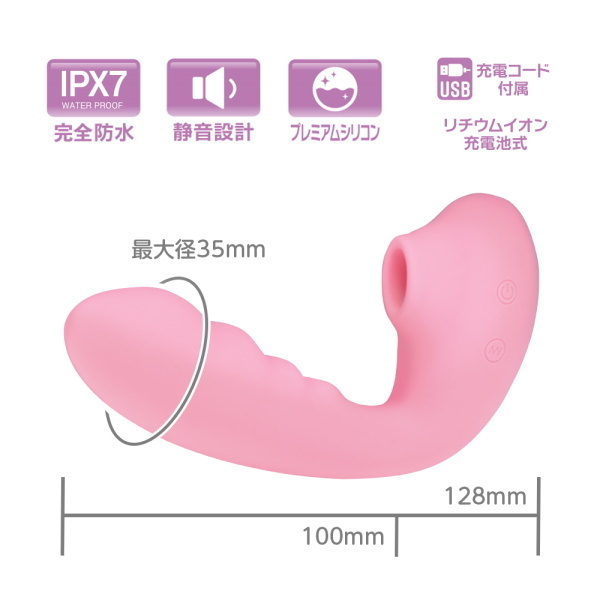 SNSで話題の<吸うやつ>吸引しながら振動を楽しめるくの字形状に温感機能搭載でリアリティUP!振動部分の形状や太さにもしっかりと拘った納得のアイテムです。しかもIPX7の完全防水性能設計だからしっかり洗えて水場での使用も問題ありません。120分充電で最大60分使用可能●カラー:ピンク