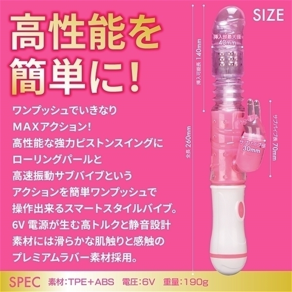 ワンプッシュでいきなりMAXアクション!強力ピストンスイング+ローリングパール・高速振動サブバイブという高性能アクションをワンプッシュで操作出来るスマートスタイルバイブでです。6V電源が生む高トルク。静音設計・生活防水に滑らかな肌触りと感触のプレミアムラバー素材採用。●カラー:ピンク