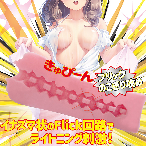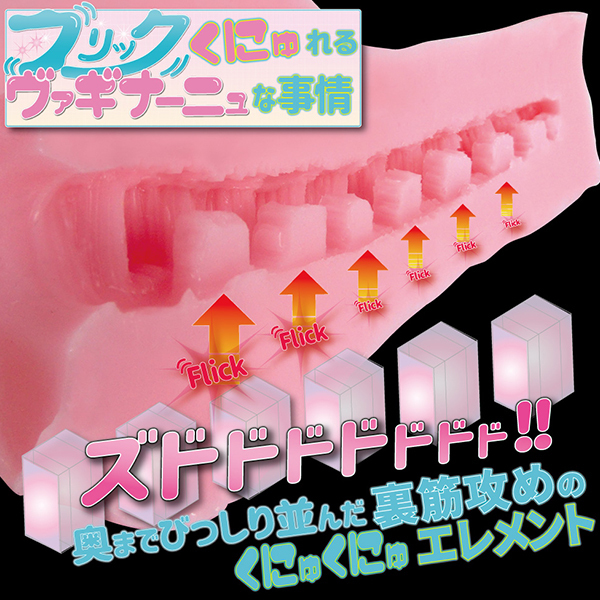 四角いキューブを奥までびっしりと配置!ギザギザ溝入りのノコギリ状壁で左右を責めつつ、四角のフリックヒダで裏スジをくにゅくにゅと刺激する♪ヒダ感溢れるライトニング刺激に身体中をビリリと快感が駆け巡る!素材には累計500万個突破した高伸縮&高弾力のバンジータッチを採用。