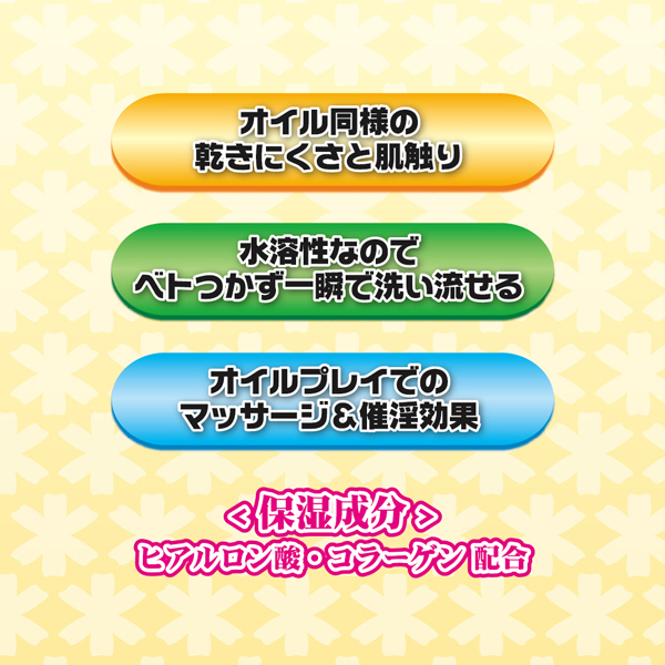 高保湿なヒアルロン酸やコラーゲンをたっぷり使用した贅沢仕様!口に入っても大丈夫な成分を使っているためオーラルプレイもOK◎オイルのような質感で乾きにくく長時間のマッサージでも大活躍♪