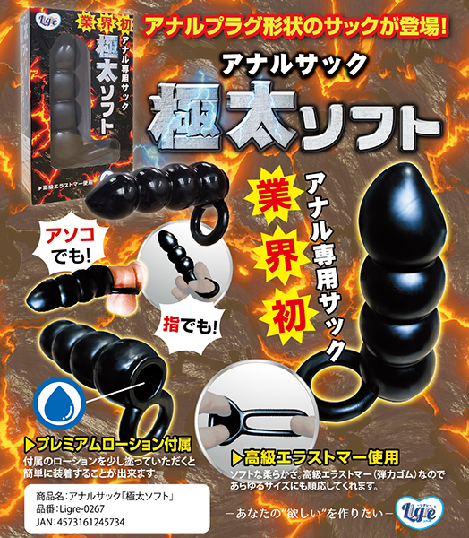 業界初!アナル専用のサックが登場!それがアナルサック「極太ソフト」です!アナル専用サックとして、アナルプラグのような形状!見た目にも強そうな作りですが、本体はやんわりソフト。