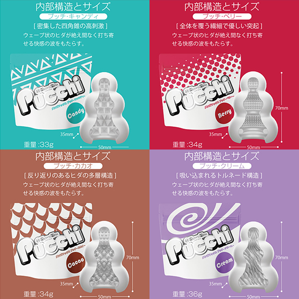 <キャンディー内部構造>「密集した四角錐の高刺激」整然と敷き詰められた四角錘の突起<クリーム内部構造>「吸い込まれるトルネード構造」斜めに擦り上げてくるヒダはクリームのように昇りつめる絶頂感<ベリー内部構造>「全体を覆う繊細で優しい突起」フワフワとした起毛が包み込みまったりしたなめらかな触感<カカオ内部構造>「反り返りのあるヒダの多層構造」ビッシリ並んだヒダは反発しながら複雑に絡みつく刺激