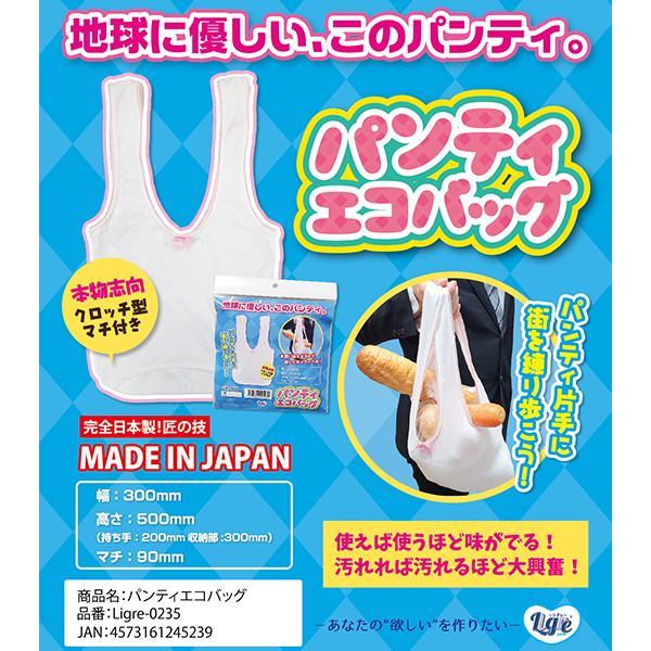パンティ片手に街を練り歩く!?誰かとすれ違いざまに思わずドキッとさせてしまう「なんだかパンティっぽい見た目」が特徴のジョーク系グッズ「パンティエコバッグ」です。小さいリボンの装飾がそれっぽく、股間部分はクロッチになっているのもポイントです♪ジョークグッズとしてプレゼントやイベントの景品としてもどうぞ。