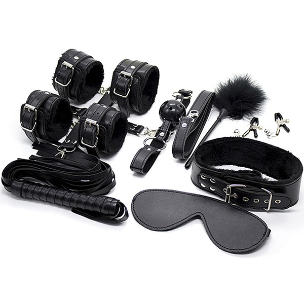 | ■ サイズ・ セット内容 | パッケージ:38.0×27.0×6.0cm セット内容:縄、アイマスク、口枷、手枷、足枷、首輪、ムチ、クリップ、ティーザー、連結用十字ベルト | ||