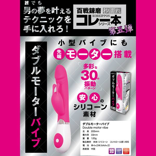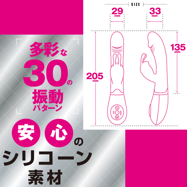大きすぎず小さすぎずなちょうど良いサイズ感で2点責めの王道タイプ!単四電池2本で駆動するバイブで30種類もの豊富なパターンで飽きずに振動刺激を体感できます♪挿入シャフトは先端が亀頭のような形状で素材にはシリコンを採用!挿入フィーリングも悪くなく、モーター内蔵の子機はウサ耳タイプとなっておりますのでクリへの刺激もダイレクトに楽しめます♪