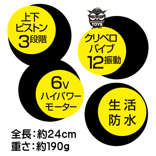 毎秒3往復!超高速ピストンで奥を貫く6Vモーター内蔵の電池式バイブ。リアルでは体験できない3段階スピードでドコドコと激しく奥突き!さらに12種類の目にも止まらぬ高速クンニで追い打ちをかける♪単4電池を4本使用、ブラックカラー