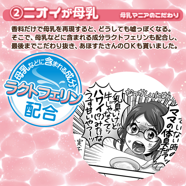 母乳成分ラクトフェリン配合!色や粘度、匂いにまでこだわった公式コラボの母乳ローション355ml。ブラに染み出すほどの粘度でリアルに演出!あほすたさんも認める懐かしい香り漂う母乳ローション。思わず吸いたくなる哺乳瓶風のキャップにも注目です♪初回生産限定、裏面に搾乳中イラスト掲載