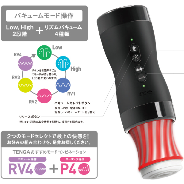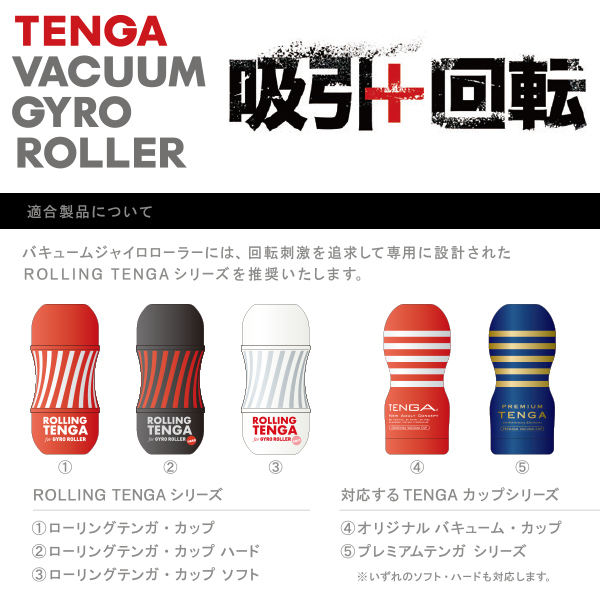 TENGAカップ用電動コントローラ「GYRO ROLLER」に強力バキューム機能を追加!4種類のリズム吸引×4種類の回転で刺激する「バキュームジャイロローラー」。ジャイロセンサー搭載!手を傾けるだけで自在にコントロールできる新感覚のテンガ体験をお楽しみください。150分間充電で約60分連続稼働可能!回転刺激を追求して設計されたローリングテンガシリーズ推奨