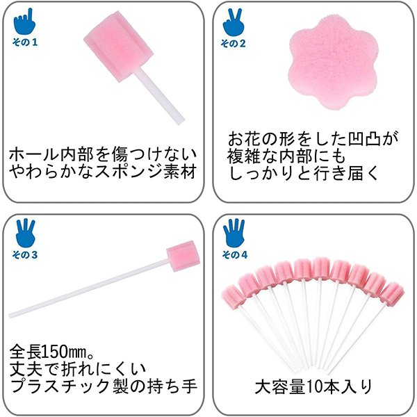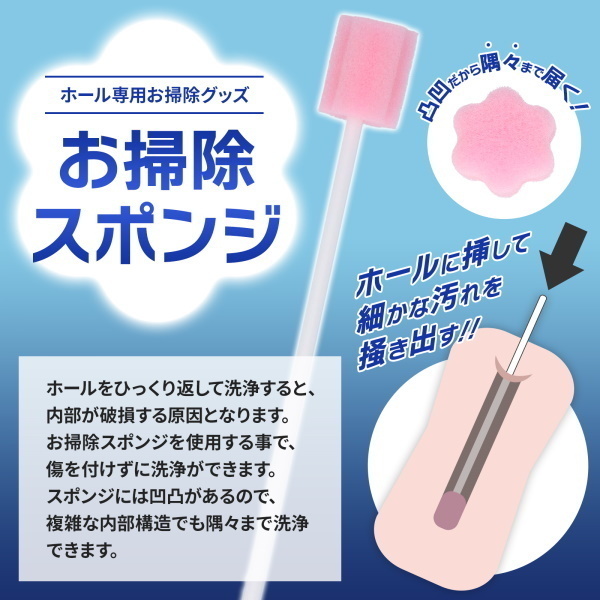 ホールをひっくり返して洗浄をすると、内部が破損する原因となります。お掃除スポンジを使用する事で傷を付けずに洗浄ができます。スポンジには凹凸があり複雑な内部構造でも隅々まで洗浄できます。