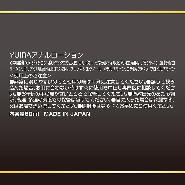 YUIRAより、使いやすいミニボトルサイズ(60ml)のローションが5種類一挙リリース量が多すぎる持ち運びずらい、そんなアナタにピッタリの商品です!アナル専用配合!乾きにくく潤い持続!ヒアルロン酸、コラーゲン入りでお肌にも優しい!アナニー時のスタンダードモデルです!安心安全の日本産商品です。