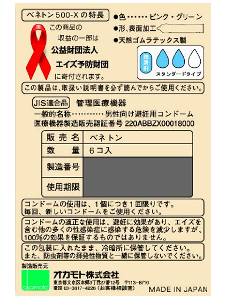 お洒落コンドームの定番品!オカモト社と人気ブランド「ベネトン」のコラボコンドーム(6個入)。女性でも手に取りやすいお洒落なパッケージを取り入れたラブアイテム!箱ごと持ち運んでも違和感のないデザイン性の高さとコンパクトさが人気です。コンドームはジェルをたっぷり塗布した一段絞りのスタンダードタイプ!その日の気分で選べるピンクとグリーンの2色入りです。