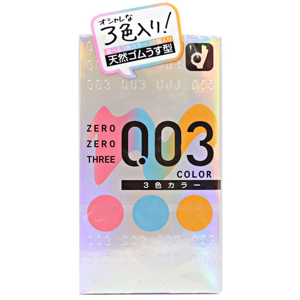 その日の気分で楽しめるピンク、ブルー、オレンジの3色入り!超極うす0.03mmの素肌感覚コンドーム(12個入)。オカモトが追い求め続けてきた「薄さゼロへの挑戦」を遂に実現しました!薄さの限界に挑戦した驚異的なその装着感は、あまりの薄さに着けている感覚を忘れてしまう程。ぬくもり伝わる超至近距離恋愛をぜひ体感して下さい。