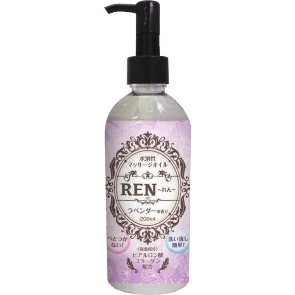 ローションを超える気持ちよさ♪ホットに感じる保湿成分配合マッサージオイル「REN〜れん〜水溶性マッサージオイル200ml」。保湿成分のヒアルロン酸Na、コラーゲン配合で潤いたっぷり!ベタつかない水溶性なので洗い流しも簡単!リラックス出来る爽やかでフローラルなラベンダーの香り付きです。