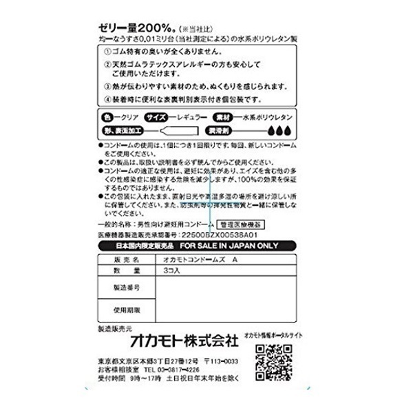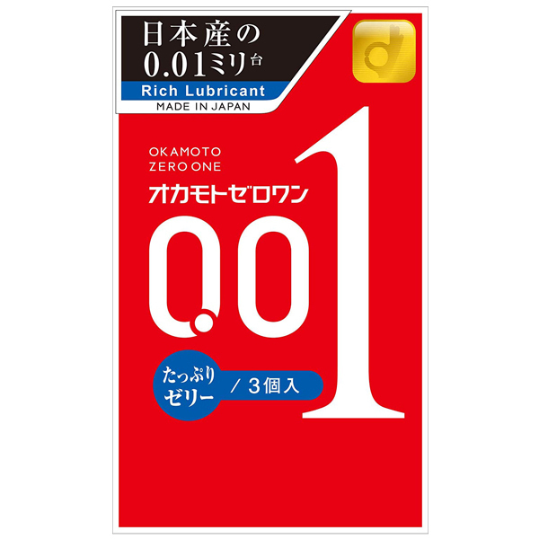 ゼリー量200%で登場♪オカモト史上最薄、異次元の密着感を実現したうすさ0.01mm台の水系ポリウレタン製コンドーム「オカモトゼロワン たっぷりゼリー3個入」。