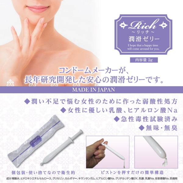 コンドームメーカーが長年研究開発した潤滑ゼリー!潤い不足で悩む女性のために作った弱酸性処方で女性に優しい乳酸、ヒアルロン酸Na。注射器型のワンタッチで手を汚さず衛生的です。
