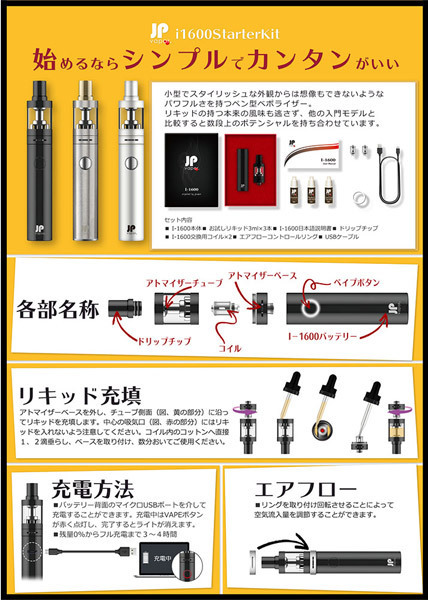 | ■ サイズ・ セット内容 | パッケージ:12.5×9.0×4.9cm 本体:12.0×1.9cm セット内容:I−1600本体、お試しリキッド3ml×3本、日本語説明書、ドリップチップ、交換用コイル×2、エアフローコントロールリング、USBケーブル USB充電式 | ||