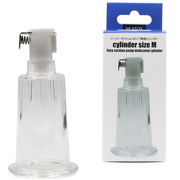イージーサクションポンプ専用シリンダーのMサイズです。こちらのMサイズは内径が2.5cmです。イージーサンクションポンプの本体にこちらの専用シリンダーを付け替えることで意図した箇所をピンポイントで吸引できます。サイズ:7.5cm×3.9cm内径:2.5cm。スタンダードにお使いいただけるサイズとなっています。