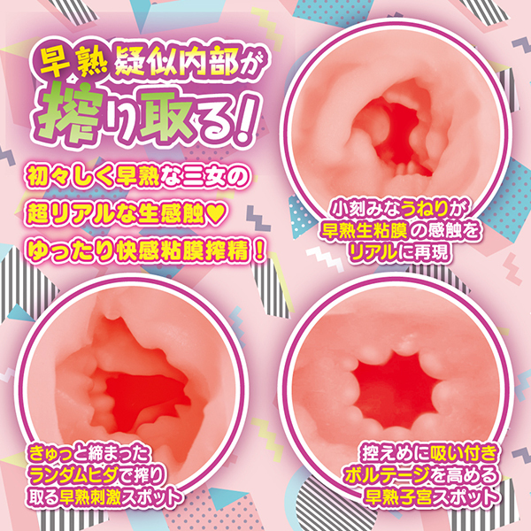 ストロークしやすいジャストグリップ構造でサイドにハンドグリップが施され、握力を伝導しやすいフォルムとなっているため、しっかり刺激を感じることができる250グラムのオナホです♪内部構造は生感触を追求した早熟疑似生粘膜構造!きゅっと締まる早熟な内部は不規則な粘膜ヒダが包み込む本物の仕上がりになっております。