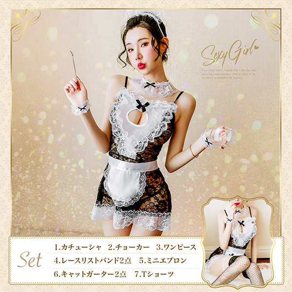 | ■ サイズ・ セット内容 | フリーサイズ セット内容:カチューシャ、チョーカー、ワンピース、レースリストバンド×2、ミニエプロン、キャットガーター、Tバックショーツ | ||