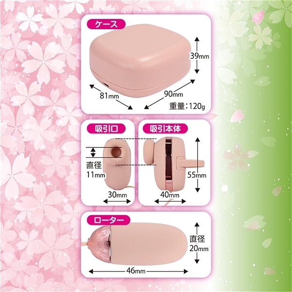 | ■ サイズ・ セット内容 | パッケージ:10.7×101×5.5cm 本体:ケース(9.0×8.1×3.9cm)、吸引(5.5×4.0×3.0cm・吸引口直径1.1cm)、ローター(4.6×2.0cm) 重量:120g | ||