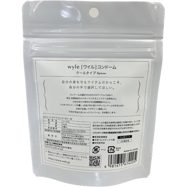 コンドームは避妊のためだけのアイテムではなく、性感染症などのセックスすることでうつる病気から、大切な身体を守る医療機器のひとつです。「コンドームの売り場に行くのが恥ずかしい」「店員さんに見られたくない」といったこれまでのイメージを覆し、女性が手に取りやすいコンドームを作るために、女性が主導してデザイン・開発した女性が本当にほしかったコンドームです。●6個入 クールタイプ