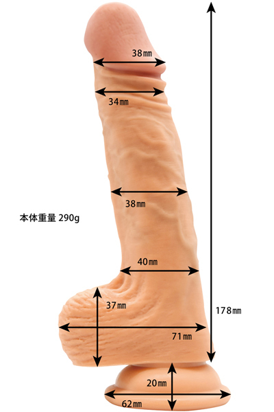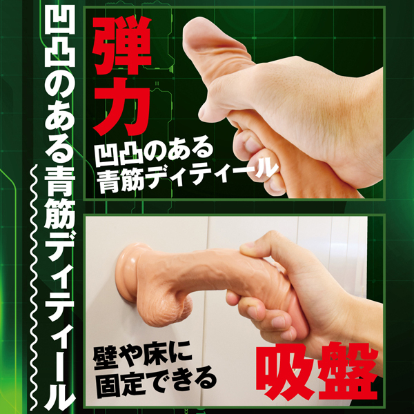青筋浮かぶリアルな造形!握ると逞しい筋肉を感じる硬芯に、外側は本物のように柔らかな外皮の二層で仕立てた超リアルな吸盤付きディルド。他のディルドにはない複雑かつ多彩な弾力のナマ質感!徹底された肉感のある弾力で興奮必至のプレイを体験♪底面には床や壁に吸着できる強力吸盤付き!こちらは程よい大きさのスタンダードサイズです。